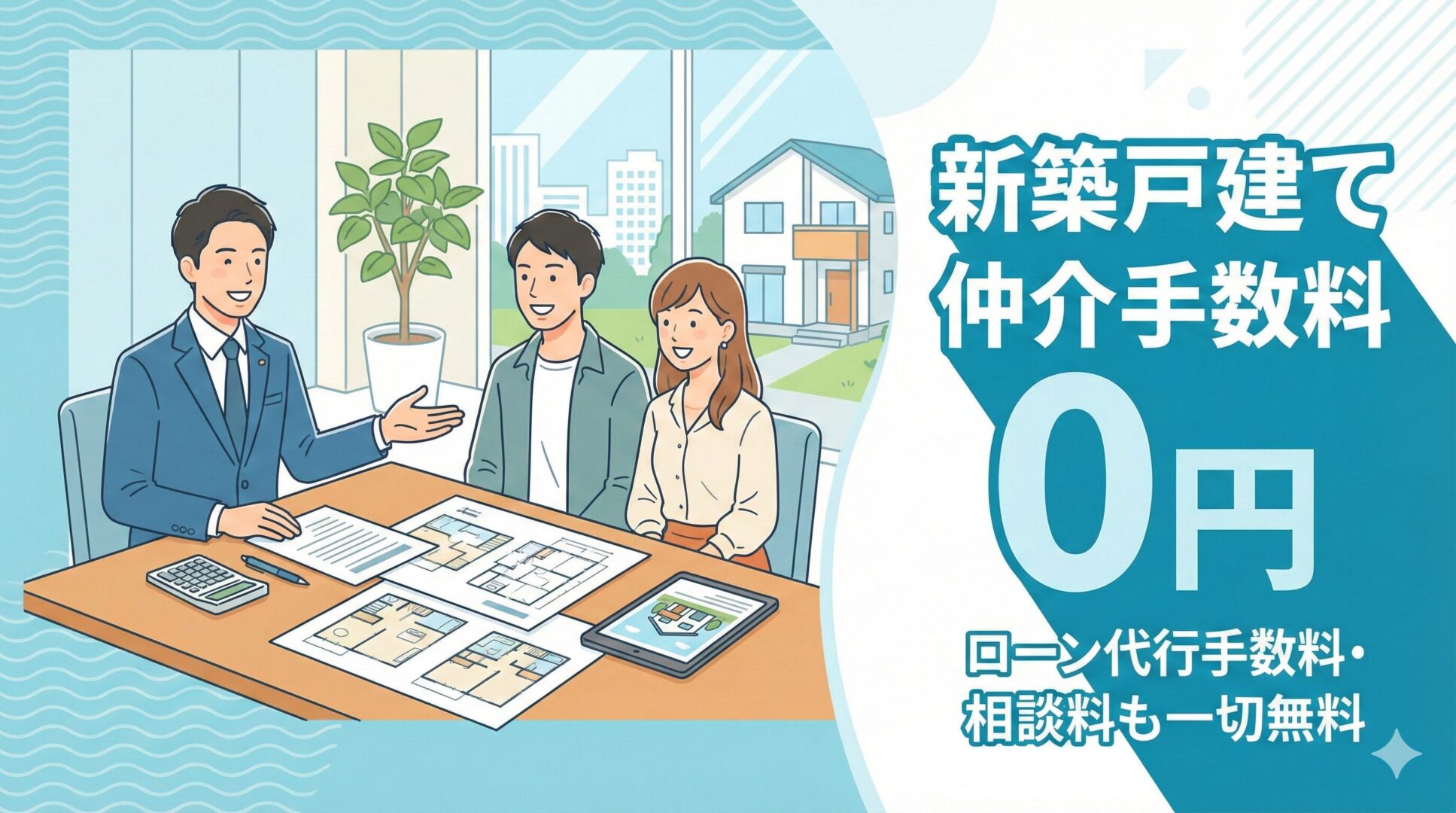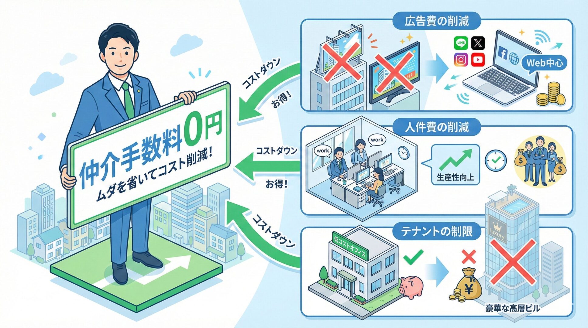 テレビCMや大量チラシなどの高額広告は行わず、Web集客とご紹介中心でコストを削減。浮いた広告費を仲介手数料0円という形でお客様に還元しています。