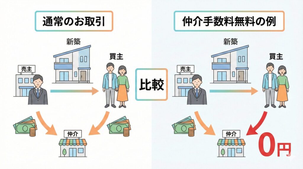 通常の取引では売主買主両方から仲介手数料をいただくのに対して、弊社の仲介手数料無料の例ですと売主からいただき、買主からはいただきません。