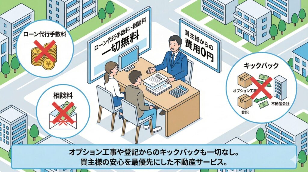 また、オプション工事や登記手続きなどからのキックバックも受け取らず、買主様の利益を最優先にした公平な立場でご提案いたします。